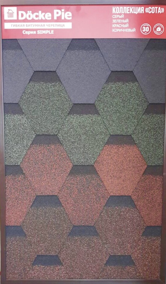 Döcke PIE SIMPLE – серия гибкой черепицы, произведенной на основе оксидированного битума. При производстве используются лучшие сорта битума и только высококачественный базальтовый гранулят. В отличие от других марок, мы не используем отходы металлургического производства, такие как шлак. Запатентованная Döcke двойная клеевая система делает укладку черепицы легкой и удобной. Гибкая черепица Döcke PIE SIMPLE, пожалуй, является лучшим ценовым предложением на рынке. Разнообразие цветов и форм позволят создать поистине уникальный объект, хорошо заметный в ряду других.